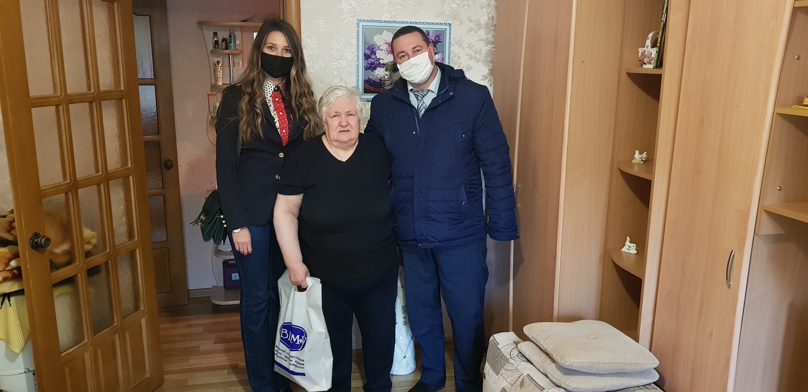 Во время поздравления с Днем пожилых людей председатель профкома сотрудников Алексей Погоцкий, председатель профкома студентов Александр Мясоедов, председатель комиссии по работе с ветеранами и молодежью профкома сотрудников Наталья Колчанова, поздравили на дому ветеранов войны и труда ВГМУ, вручив продуктовые наборы.